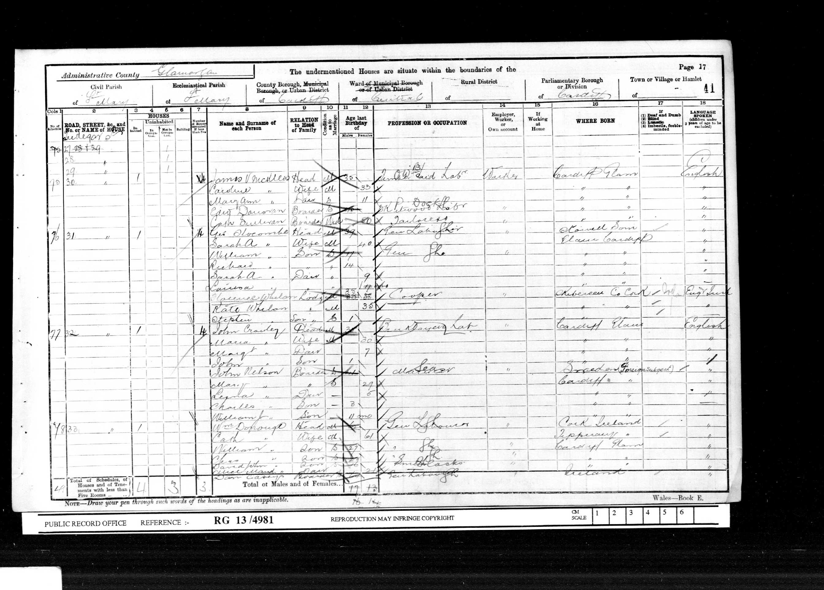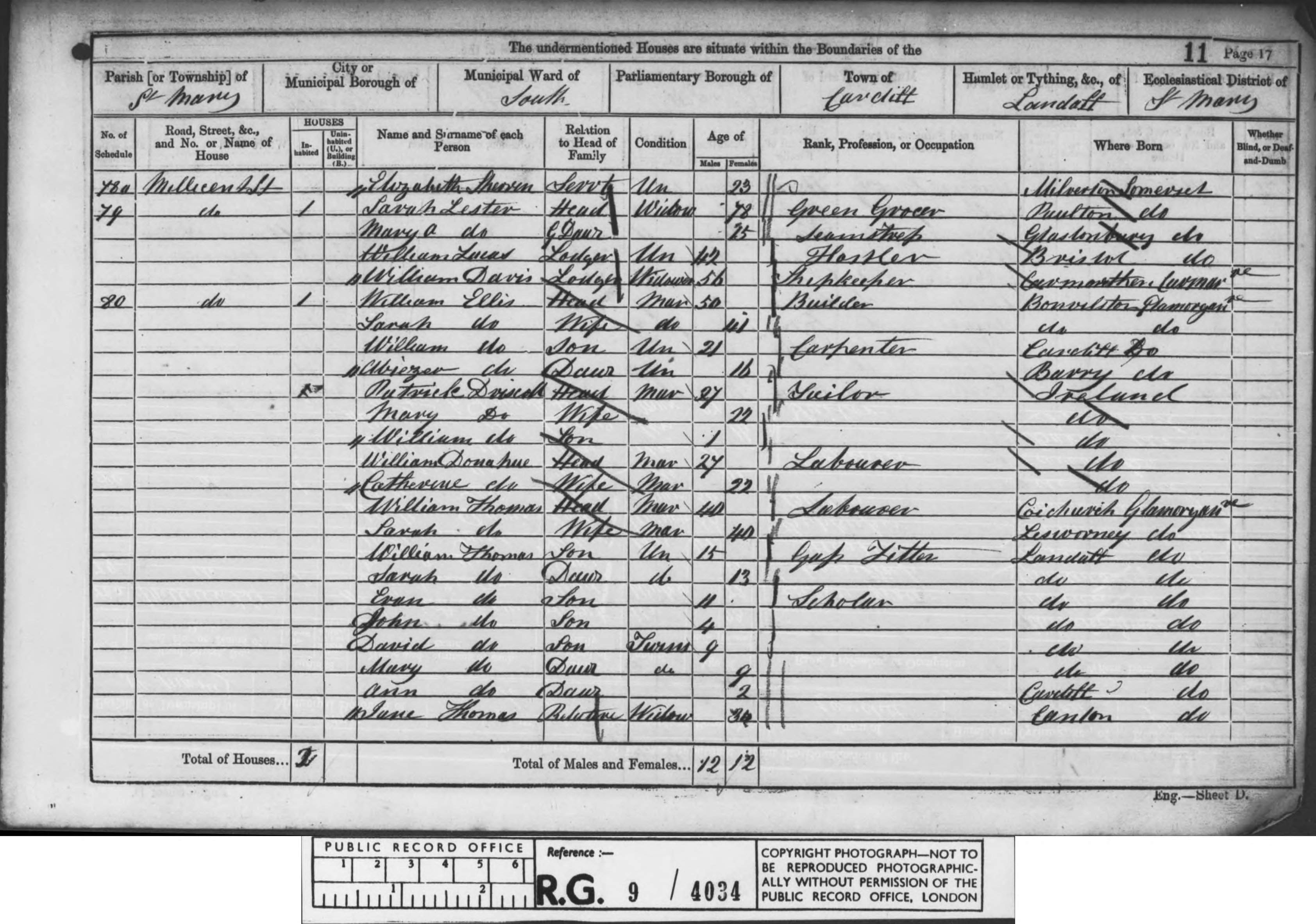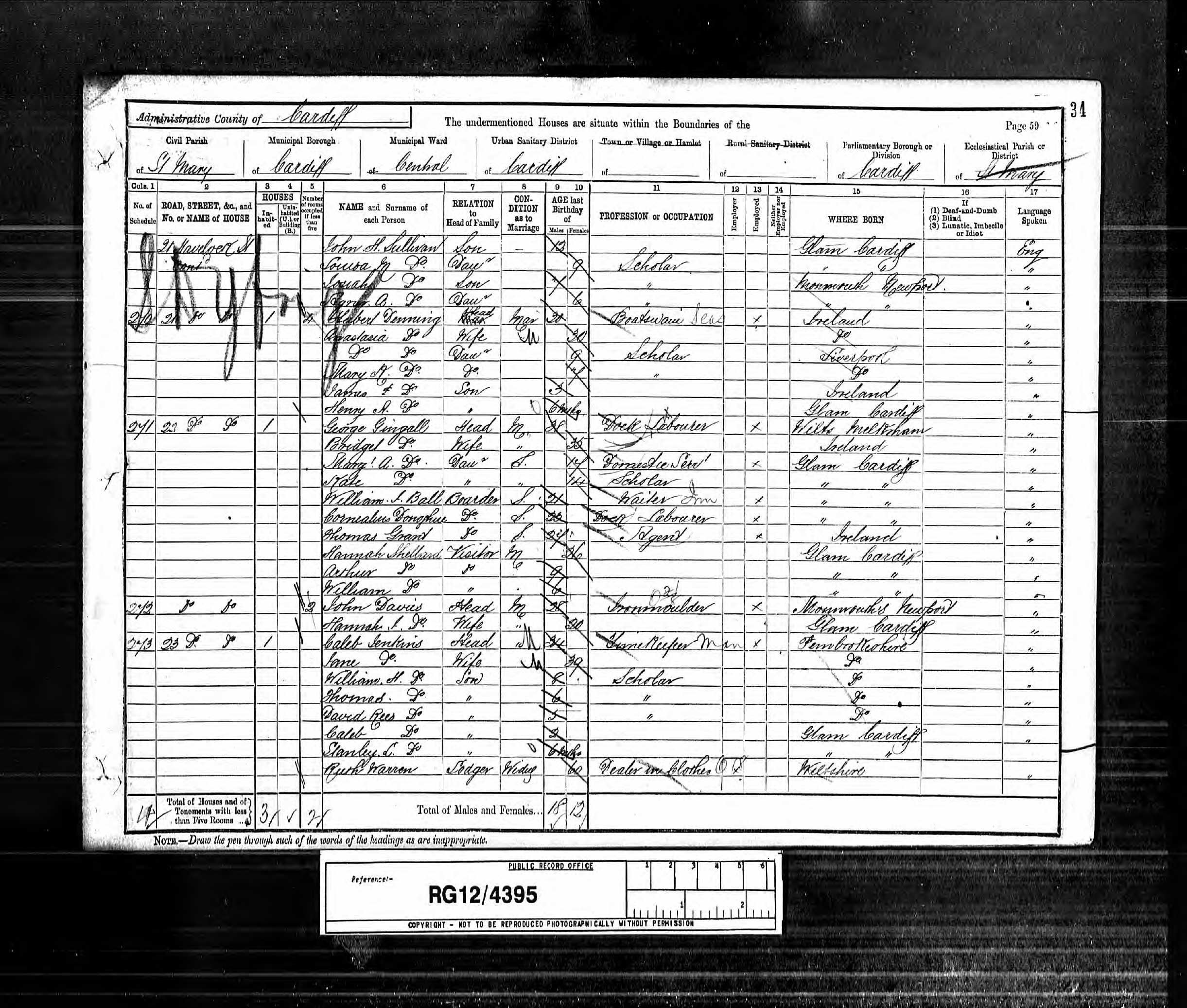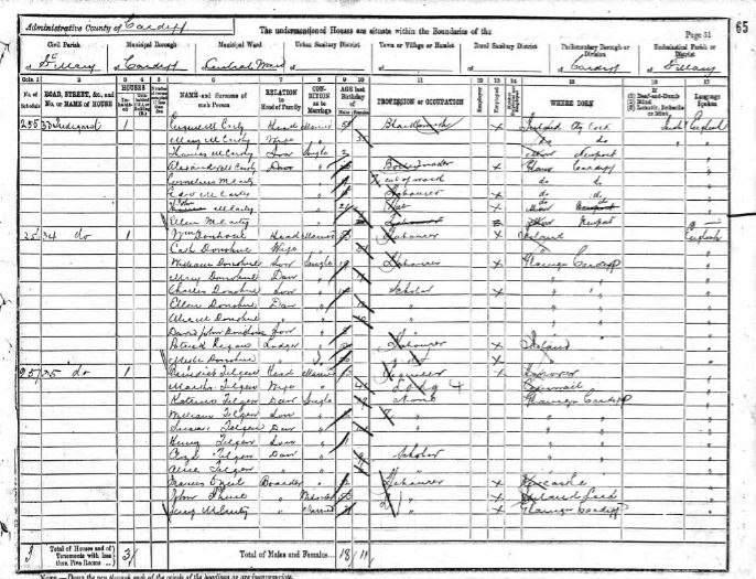 Go back 10 years to 1891 and the family are listed at 34 Tredegar Street, Cardiff. William and Catherine's ages are listed as 53 and 51 respectively and both are born in Ireland, William's occupation is given as labourer. Children named as William (1872), Mary (1873), Charles (1877), Ellen (1878-1893), Alice M (1880) and David John (1884), all born in Cardiff. The name is spelled as Donohue.