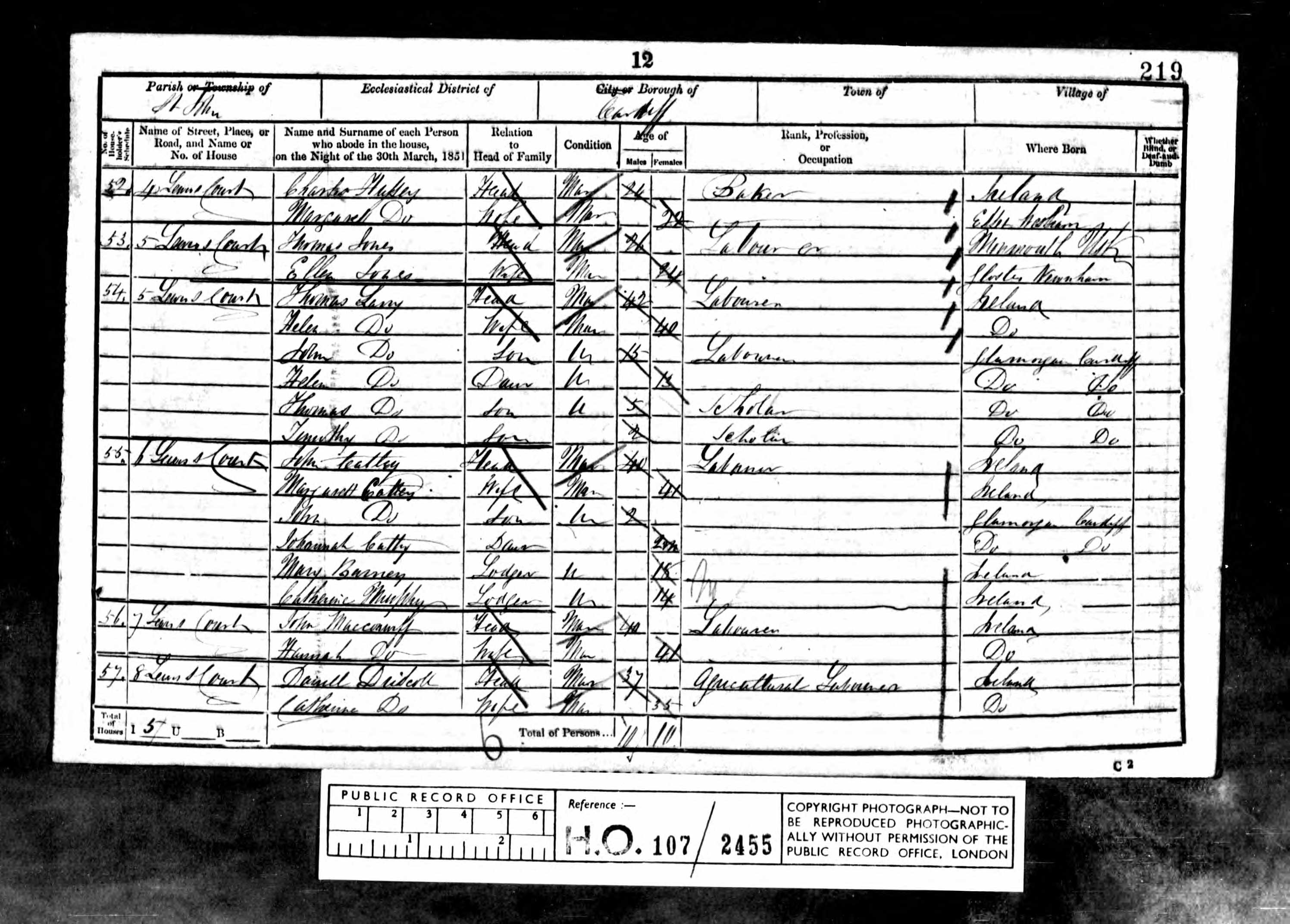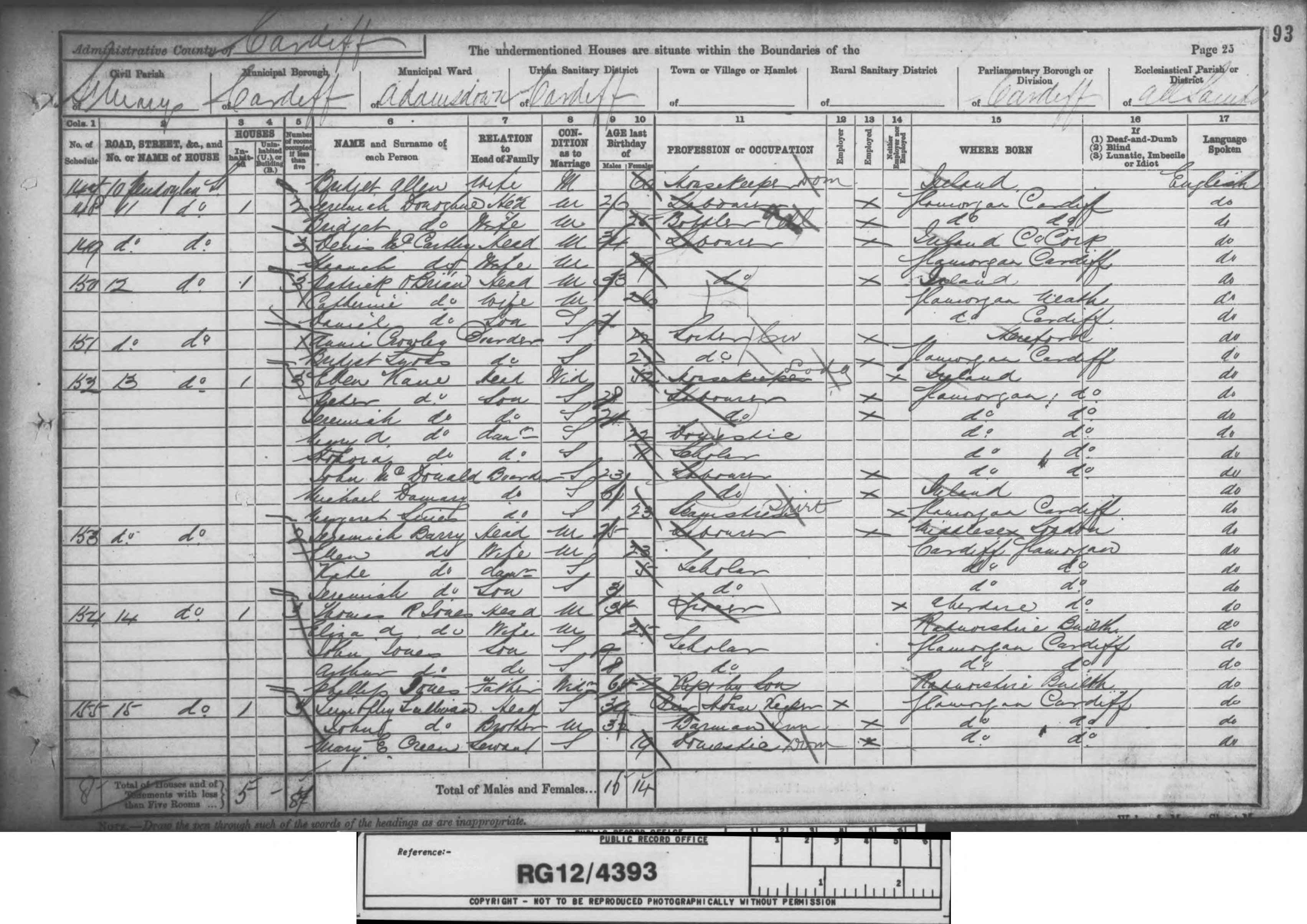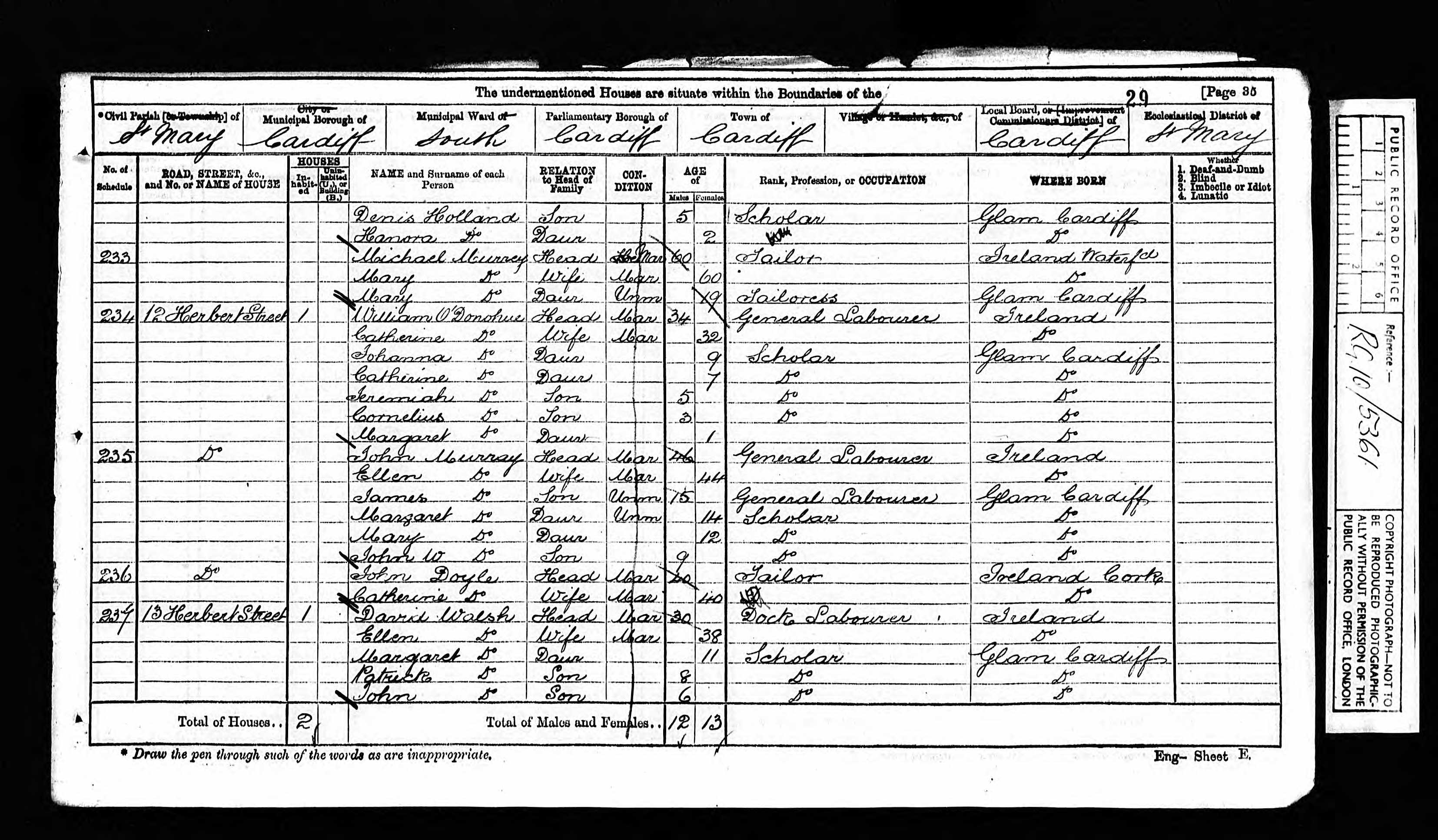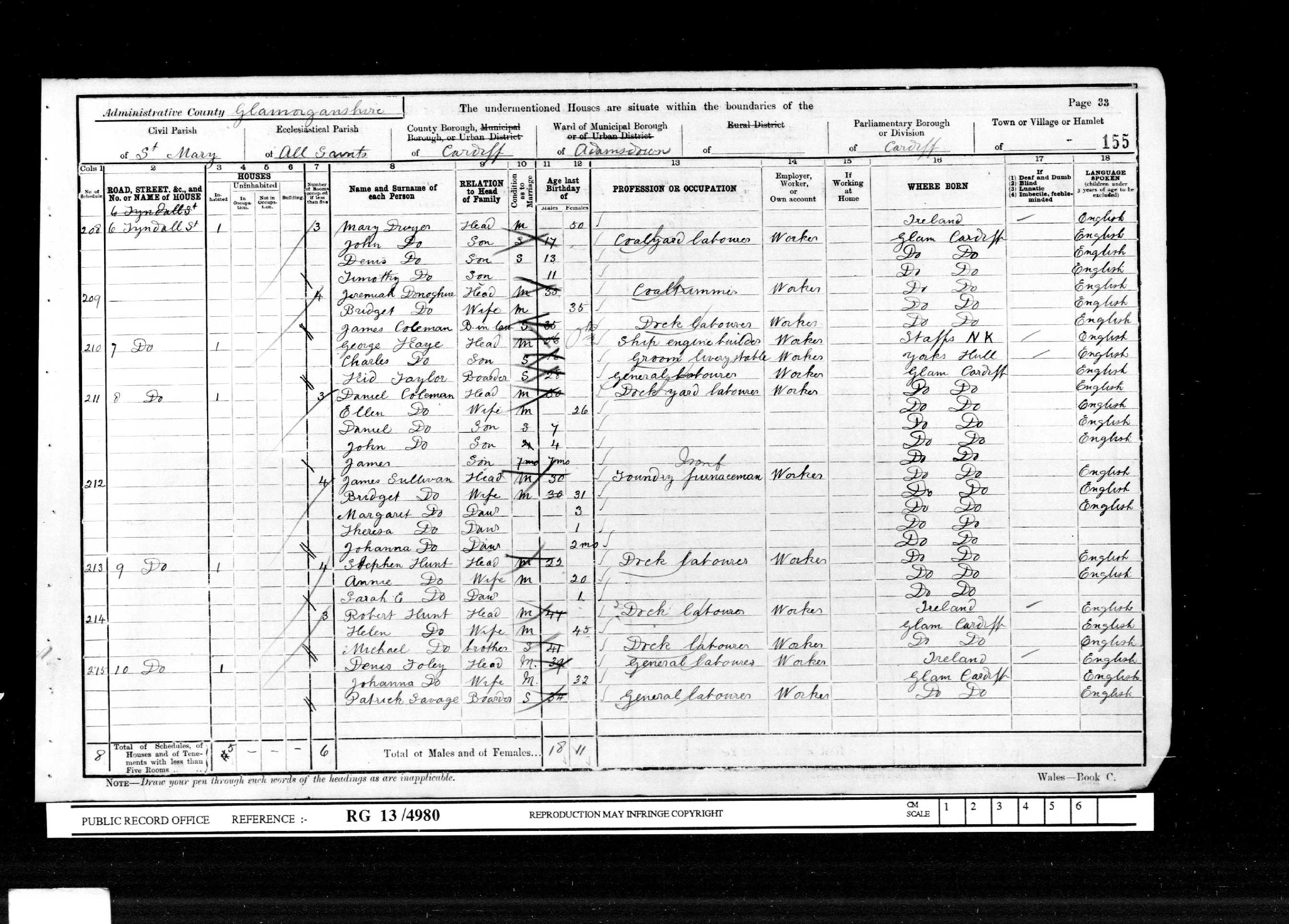 Go back 10 years to 1891 and the family are listed at 34 Tredegar Street, Cardiff. William and Catherine's ages are listed as 53 and 51 respectively and both are born in Ireland, William's occupation is given as labourer. Children named as William (1872), Mary (1873), Charles (1877), Ellen (1878-1893), Alice M (1880) and David John (1884), all born in Cardiff. The name is spelled as Donohue.