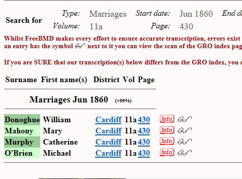 There is a marriage record for William Donohue and Catherine Murphy in Cardiff in 1860 and they can be found together in 1861 census living in Millicent Street. It states that William is 27 and a labourer and Catherine is age 22 both born in Ireland. There is an entry for a Catherine Murphy in the 1851 census.