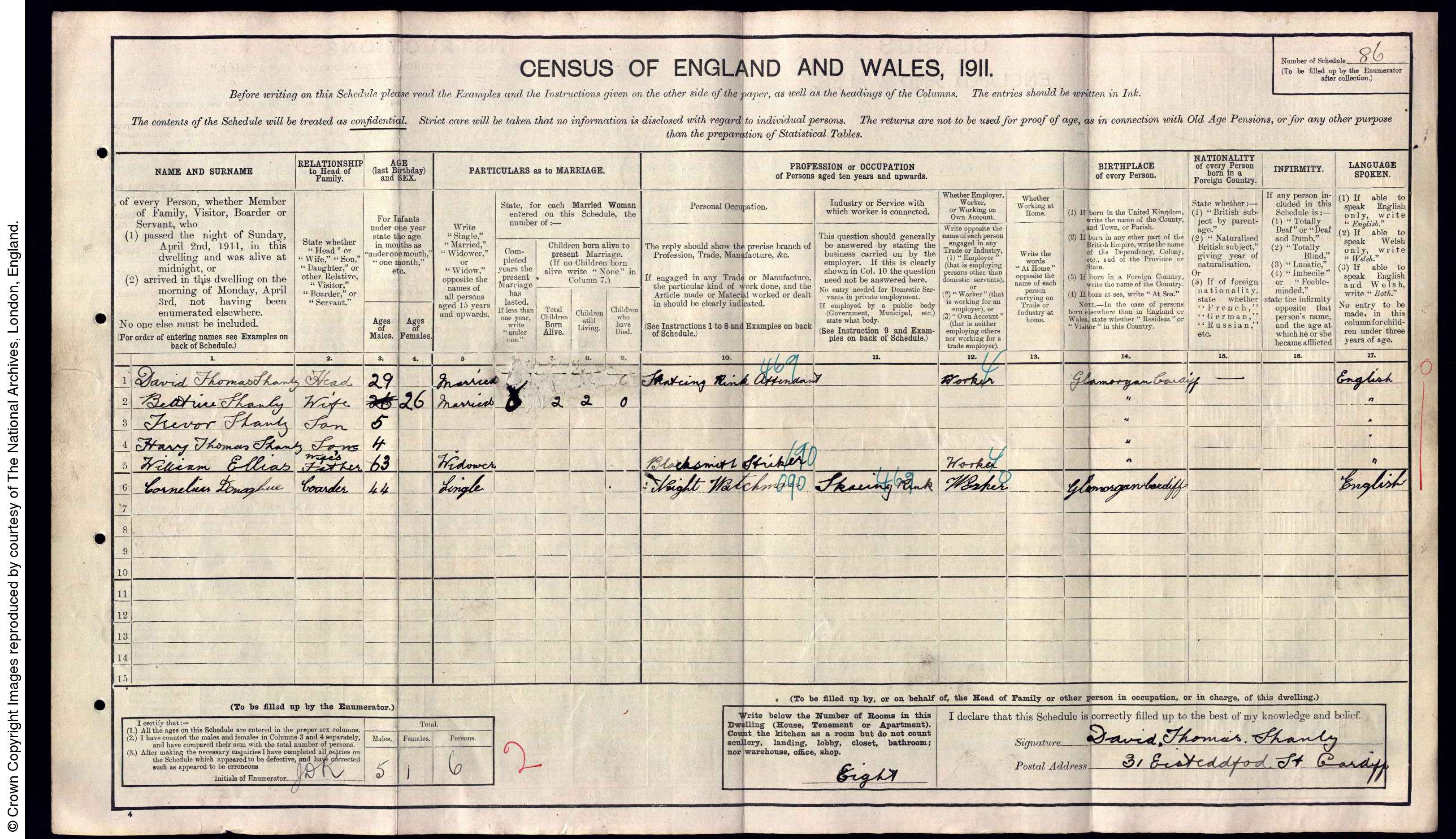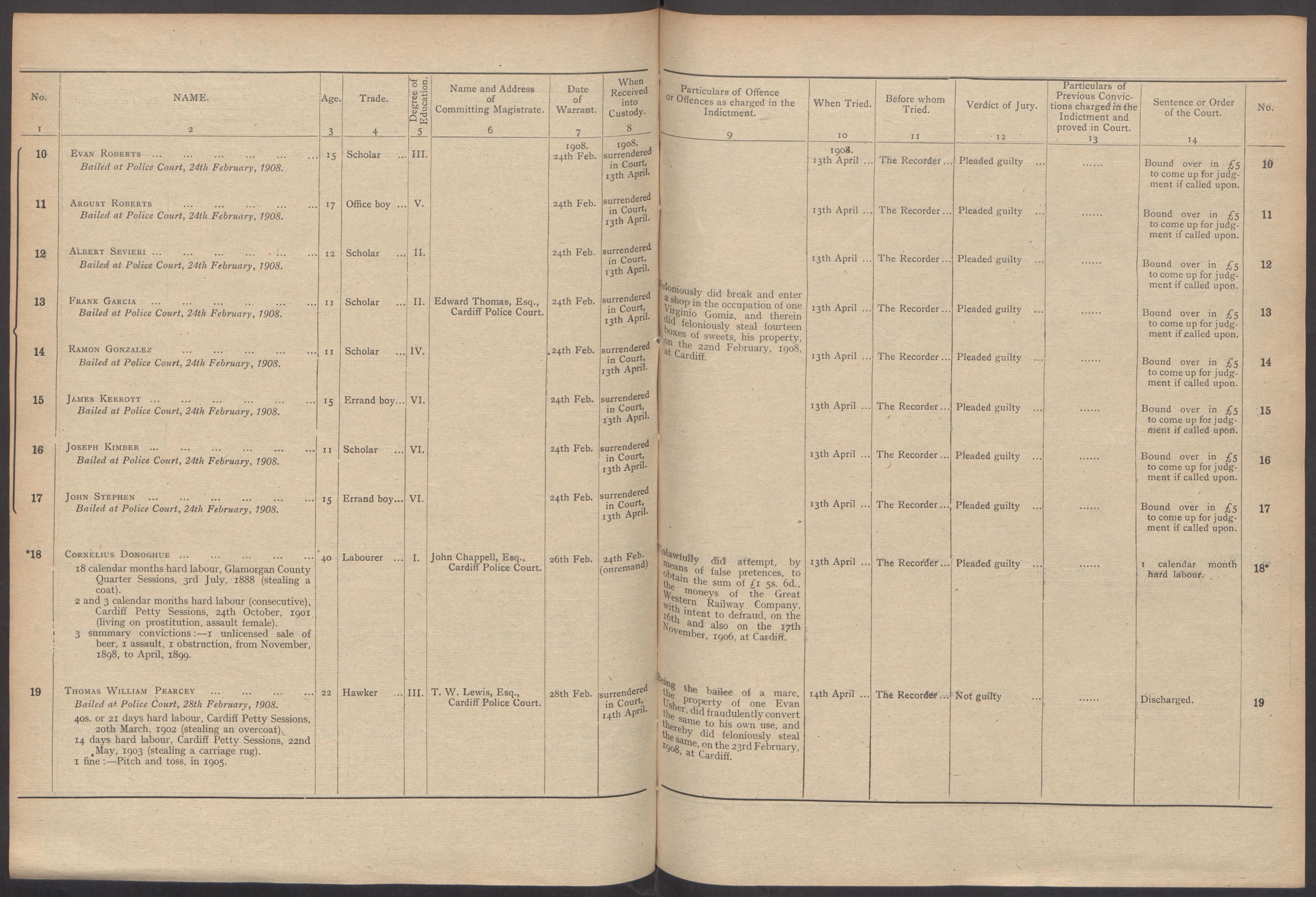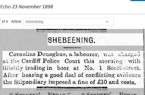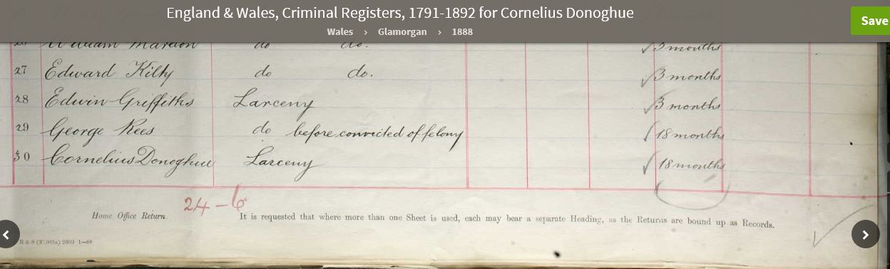 Cornelius - 1867: There is a birth registration for a Cornelius O'Donohue in 1867 and a death in 1914. Cornelius seems to be the black sheep of the family! In 1888 he was involved in an affray and charged with stealing a coat. He was sentenced to 18 calendar months hard labour. Later a petition was sent to the Home secretary because it was felt the sentence was too harsh. In 1891 he is a dock labourer boarding at 23 Havelock St, he gets involved with a charge of embezzlement at a cinema in Newport. In 1894 there is an entry for Cornelius in the Dreadnought Seaman's Mission at Greenwich, it states that he was a coal trimmer on the Lady Salisbury. He married in 1896 but I am not sure if he married Mabel Casper or Annie Rowlands. In 1898 he was fined £10 and costs for illicitly trading in beer (shebeening). In 1901 he was sentenced to 5 months imprisonment - 2 months for assault and 3 months for his immoral course of life (living on prostitution). In 1903 he is listed as deserting the SS Rowanmore. He signed on as a crewman on 2/6/1903 having previously been signed on the Ulstermore, and deserted on 11/7/1903. I cannot make out the port it could be a abbreviation for Baltimore. His home address is given as 52 Silvestre Street. There are several records of A Cornelius Donague on Crewlists for ships out of Liverpool for the years 1902 - 1904 but although the birth year corresponds the place of birth is given as Liverpool In 1906 he was remanded in custody for unlawfully attempting, by means of false pretences to obtain the sum of £1 15s 6d from the Great Western Railway Company. He was sent to trial on the 13th April, pleaded guilty and was sentenced to 1 month hard labour. In 1911 he is boarding with the Shanly family at Eisteddfod Street and working as a nightwatchman at a skating rink. Cornelius died in 1914.
