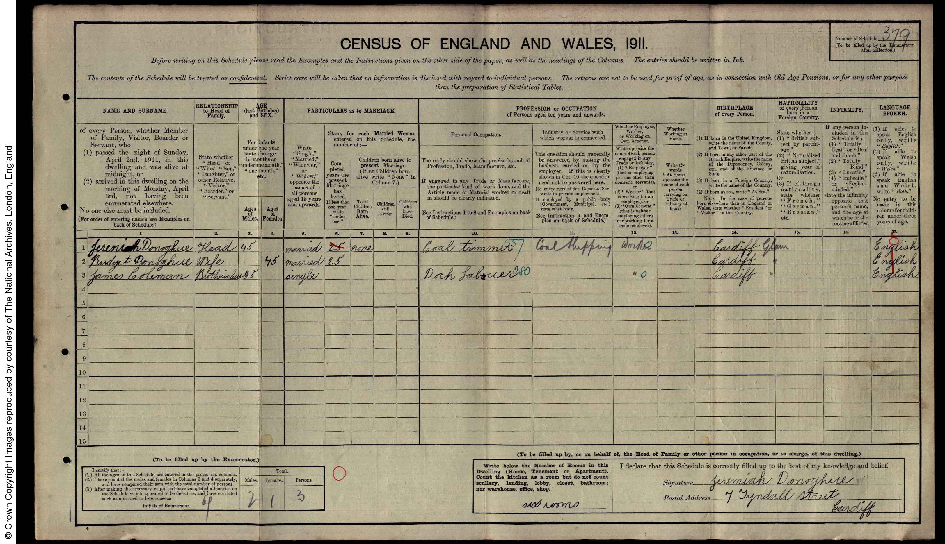 Jeremiah - 1865: There is a birth registration for a Jeremiah Donoghue in Cardiff in 1865 and a registration of death in 1929. Jeremiah married Bridget Coleman in Cardiff in 1886, Bridget was considerably older than Jeremiah and there were no children from this marriage. There are census entries for the couple living at 10 Pendoylan Street in 1891, 6 Tyndall Street in 1901 and still at Tyndall Street in 1911.