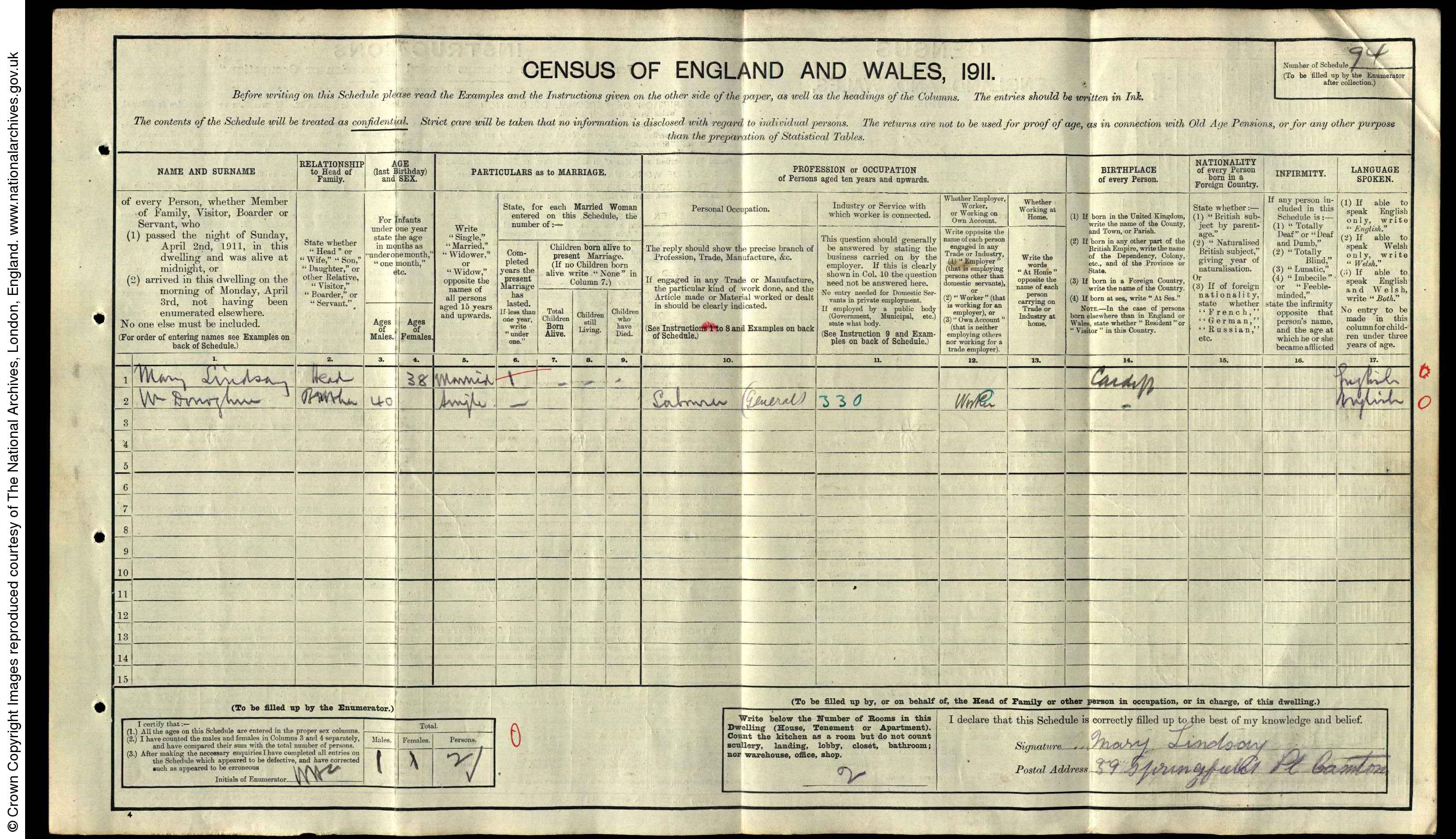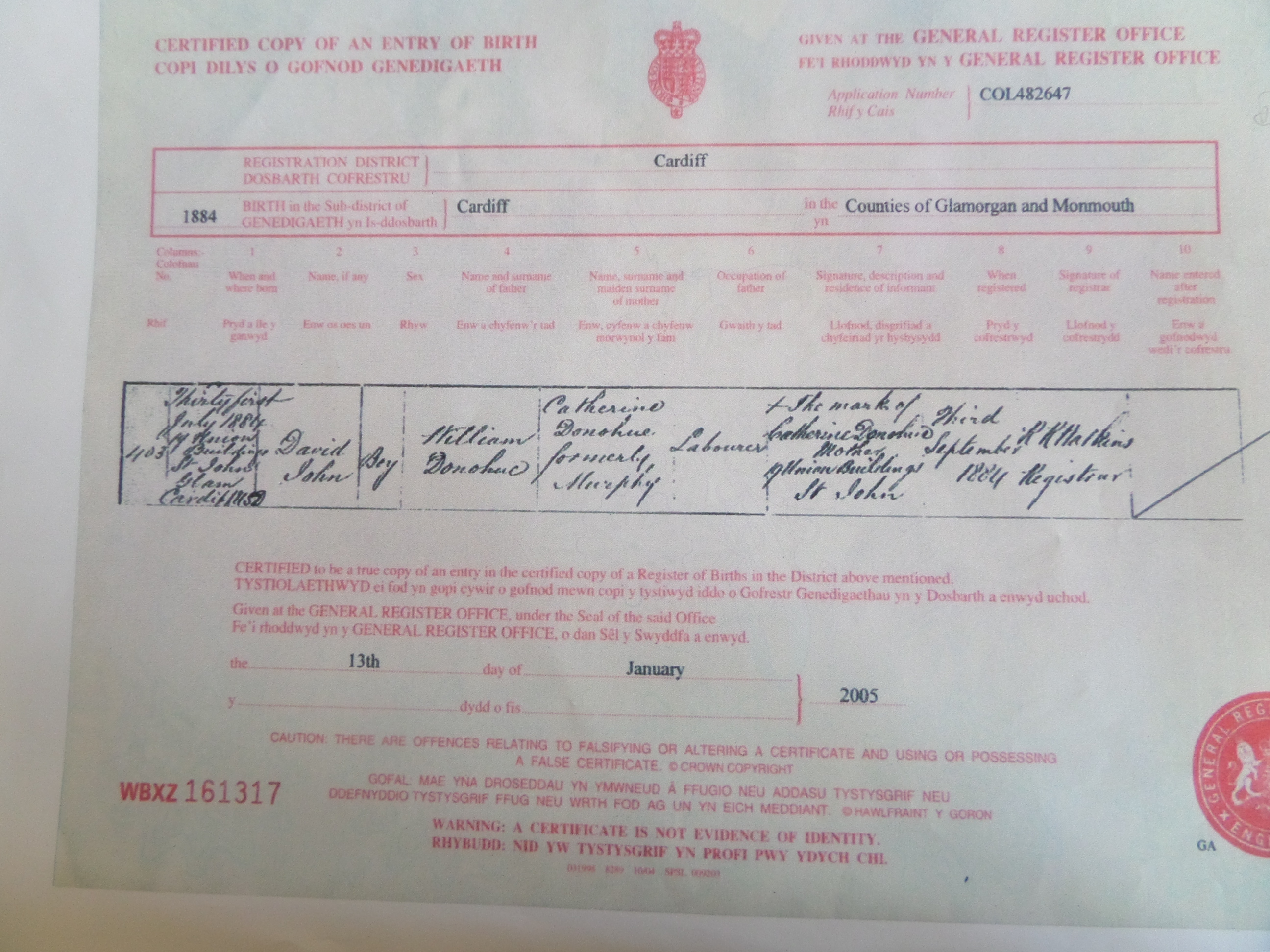 William - 1872: There is a birth registration for William Donoghue in Cardiff in 1872. William never married and died in Cardiff in 1941. In 1911 he is living with his sister Mary (Mary Lindsay) in Springfield Place, Canton.