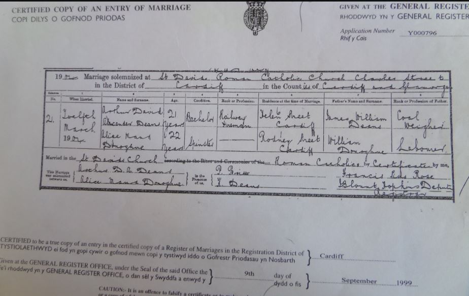 On 12th March 1904 Alice DONOGHUE married Arthur David Alexander DEANS in St David's Cathedral, Cardiff. Alice was 22 years old and of no known occupation but her father's occupation is given as labourer. She was living at 22 Rodney Street, Cardiff (where St David's Centre now stands).The witnesses to the marriage were P. BRITT (Alice's brother-in-law, Patrick, married to her sister Mary) and K. Deans (Arthur's sister Catherine known as Kitty).