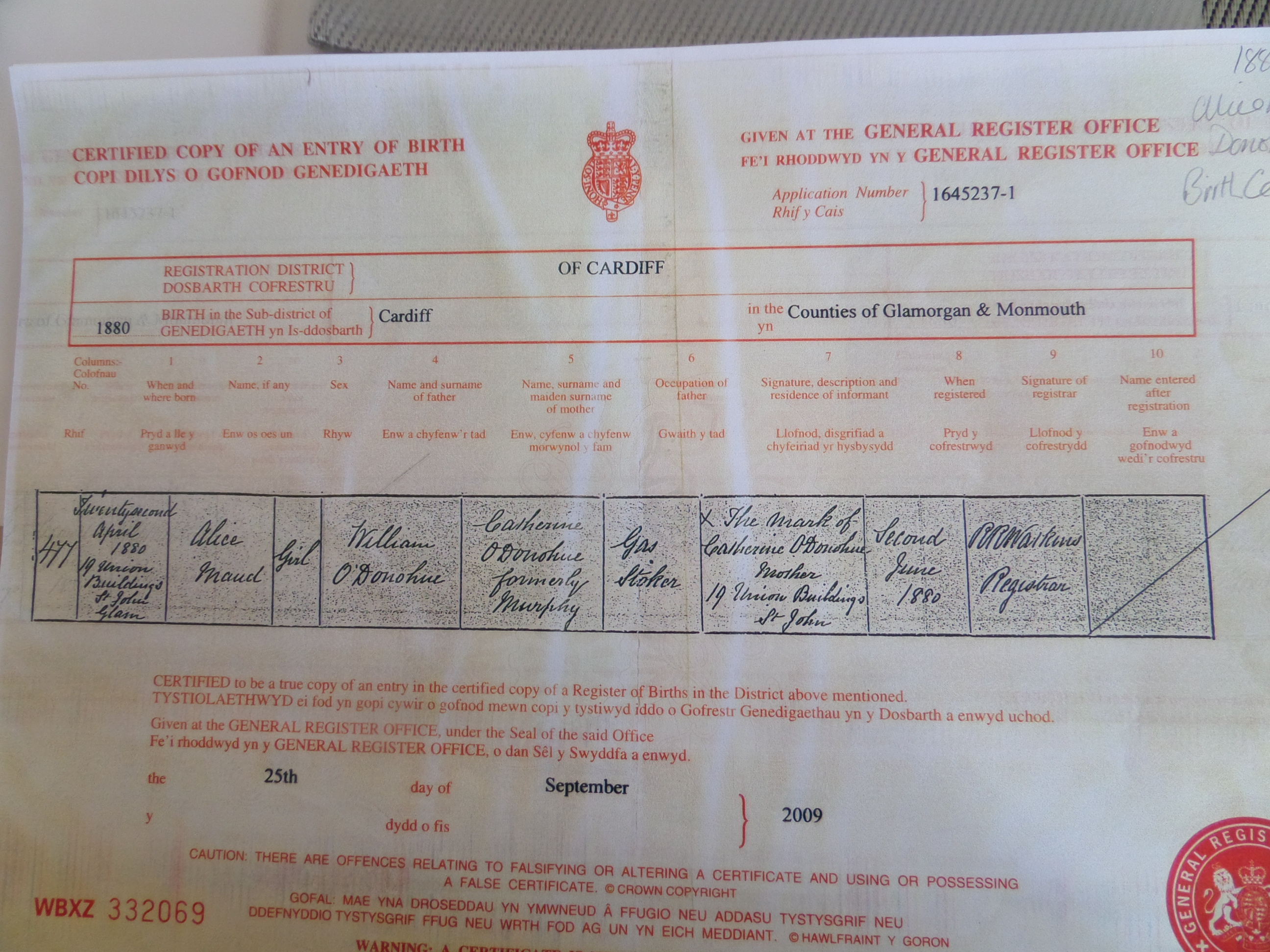 Alice Maud O'DONOHUE was born on 22nd April 1880 at 19 Union Buildings in Cardiff. My first thoughts were that Union Buildings meant that she was born in the workhouse but apparantly Union Buildings stood where the Morgan Arcade now stands and was where some of the earliest Irish immigrants to Cardiff made their homes. Alice was the daughter of William O'DONOHUE and Catherine MURPHY.